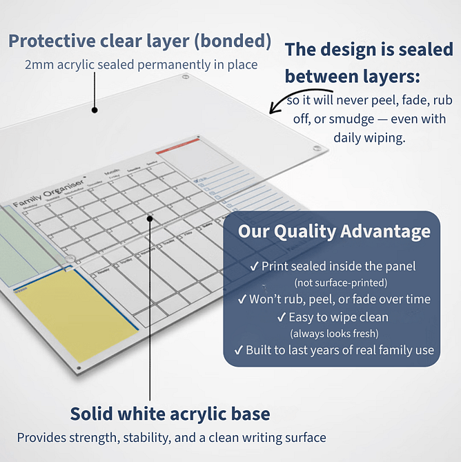 Because the design is sealed between layers — 2mm clear acrylic bonded to a 5mm white backing — it does not fade, peel or wear down with cleaning. You are not writing on exposed ink. You are writing on a durable surface engineered for repeated use.